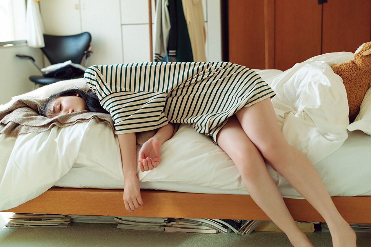 温泉街やホテルの一室でのランジェリーシーンでは大人な表情も見せている。